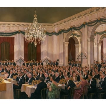 In the mid-1930s, more than six years after the Light's Golden Jubilee celebration, Henry Ford commissioned a panoramic painting of that evening's banquet. Letters were sent to attendees asking them to indicate on an enclosed diagram where they sat and for a photograph so that their image could be included in the painting. P.E. Martin tried to remember his exact location, but only gave an approximation.