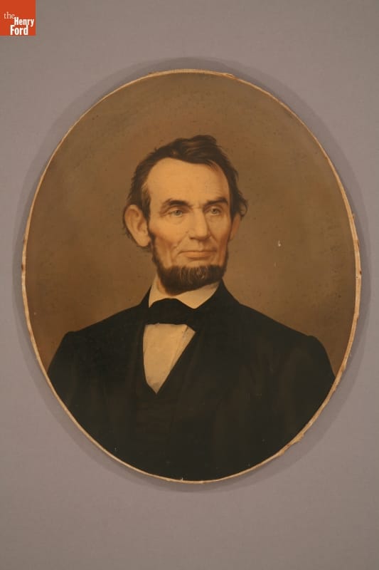 A color lithograph bust portrait of a bearded President Abraham Lincoln. E.C. Middleton & Co. of Cincinnati, Ohio made this print to resemble a painting by printing it on paper with oil-based color inks, then varnishing and gluing it onto canvas. They then attached it to an oval wooden stretcher and placed it in a decorative picture frame. This ornamental piece often found a place in the home parlor for many Americans along with their framed family portraits. This print was a popular way to honor and remember President Abraham Lincoln. The Middleton company first produced this print in 1863. The portrait was so popular that they kept making the printed portraits after Lincoln's assassination. It was an accepted way to mourn his death and honor his leadership during the Civil War.