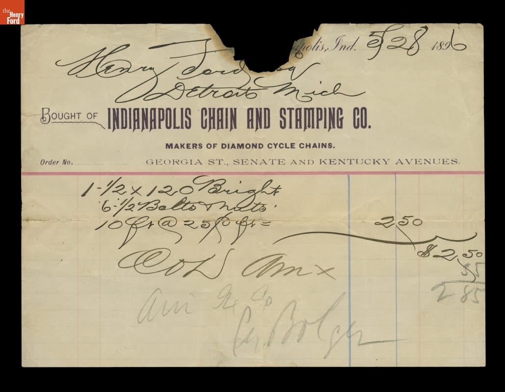 printed at top of letterhead receipt: [missing] apolis, Ind. / Bought of INDIANAPOLIS CHAIN AND STAMPING CO. / MAKERS OF DIAMOND BICYCLE CHAINS / GEORGIA ST., SENATE AND KENTUCKY AVENUES handwritten in ink: 5-28-1896 / Henry Ford [E]sq. / Detroit, Mich. handwritten lower down: 1-1/2 x 120 Bright / 6-1/2 Bolts & Nuts / 10 ft @ 25c ft = 2.50 / [plus other illegible writing] (Total) 2.85
