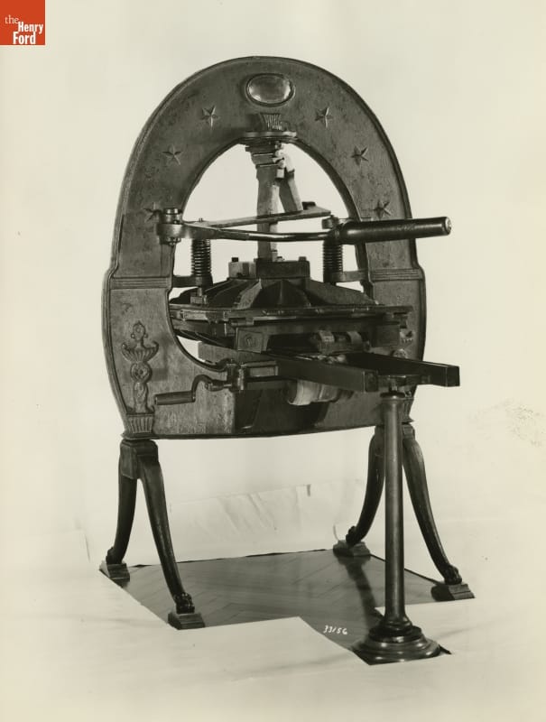 This press represents the original form of the Washington Hand Press. It established two innovations in printing history: a lightened metal frame for easier transport, and a toggle-joint mechanism to create impressions. This press was used by the Hostetter Company in Pittsburgh. As proprietors of "medicinal" tonics with high alcohol content, the company was successful during the Temperance and Civil War eras.