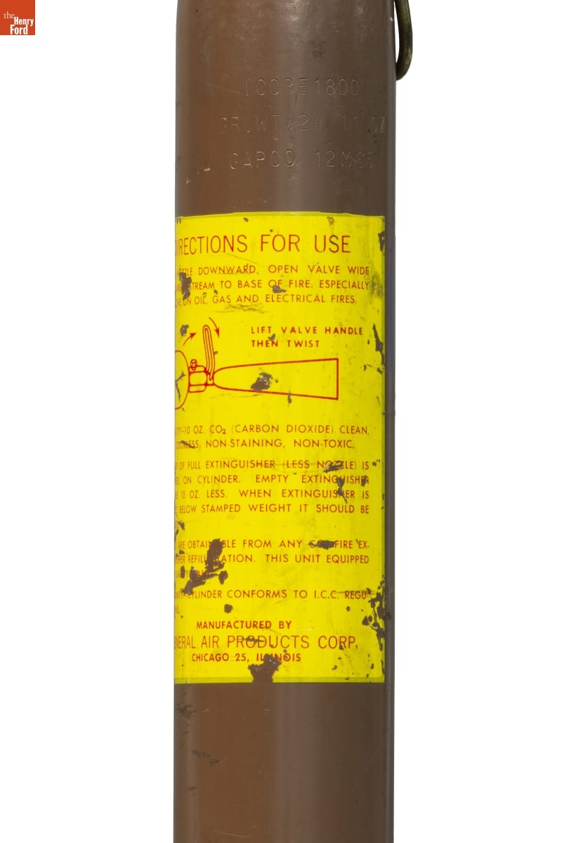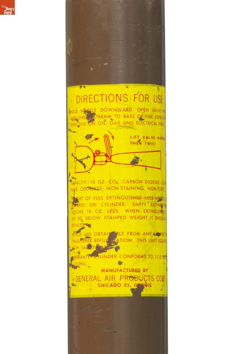 on front: DIRECTIONS FOR USE / HOLD NOZZLE DOWNWARD. OPEN VALVE WIDE / AND DIRE[CT S]TREAM TO BASE OF FIRE. ESPECIALLY / EFFECTIVE ON OIL, GAS AND ELECTRICAL FIRES. / LIFT VALVE HANDLE / THEN TWIST / CAPACITY - 10 OZ. CO2 (CARBON DIOXIDE) CLEAN, / SAFE, ODORLESS, NON-STAINING, NON-TOXIC. / W[EI]GHT OF FULL EXTINGUISHER (LESS NOZZLE) IS / STAMPED ON CYLINDER. EMPTY EXTINGUISHER / WEIGHS 10 OZ. LESS. WHEN EXTINGUISHER IS / SIX OZ. BELOW STAMPED WEIGHT IT SHOULD BE / REFILLED. / REFILLS ARE OBTAI[NA]BLE FROM ANY C[?]FIRE EX- / TINGUISHER REFIL[?]ATION. THIS UNIT EQUIPPED / WITH SAF[TE]Y [?] / WARRANTY - CYLINDER CONFORMS TO I.C.C. REGU- / LATIONS. / MANUFACTURED BY / GENERAL AIR PRODUCTS CORP. / CHICAGO 25, IL[LI]NOIS