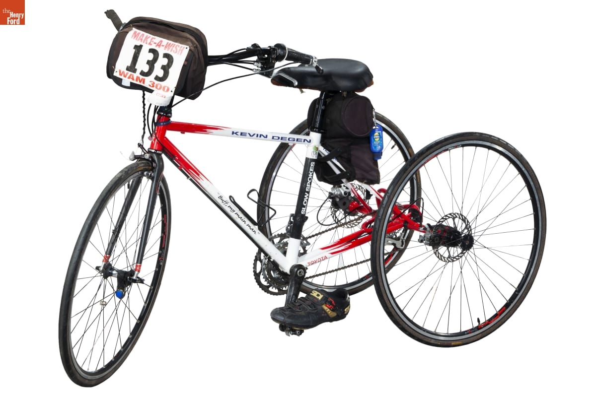 Kevin Degen raised hundreds of thousands of dollars cycling for charitable causes. Degen was born with cerebral palsy and rode using only his left leg and left arm. Toyota engineers designed this tricycle for him. The seat is offset to accommodate Degen's off-center riding posture, and the shift and brake controls are all on the left handlebar.