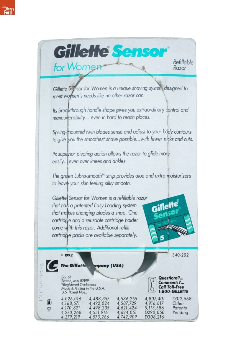 Industrial designer Jill Shurtleff studied how, where, and why women shaved before creating the Sensor for Women, the first razor designed specifically for women, in 1992. Instead of a traditional thin T-shaped body, the Sensor had a wide handle for users to maintain their grip, and the blade-head was at a 46-degree angle to prevent cuts in hard-to-see areas like underarms.
