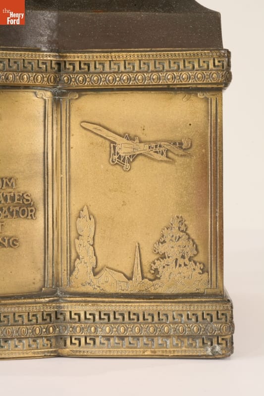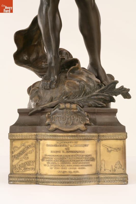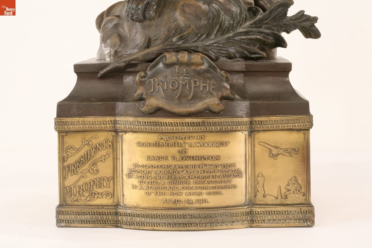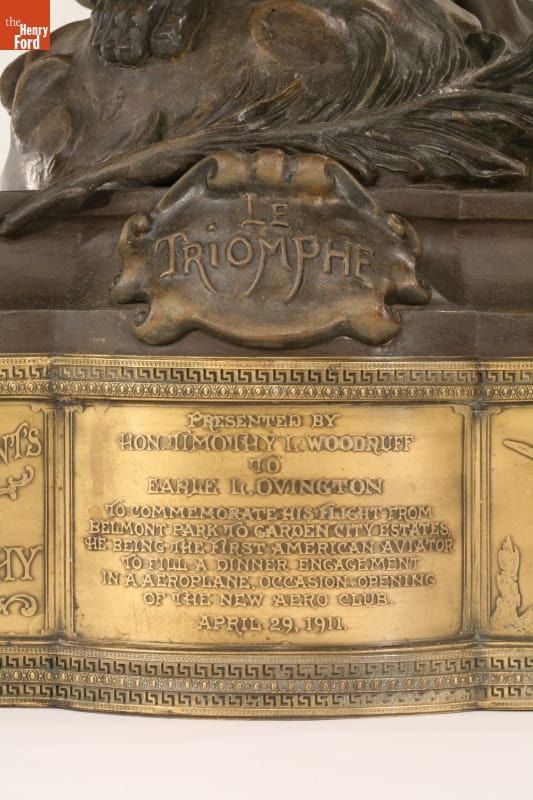 Marked in zinc below feet: LE TRIOMPHE. Also marked in zinc: LOUIS MOREAU/SALON BEAUX-ARTS. Left section marked: PRESIDENTED BY / HONORABLE TIMOTHY L. WOODRUFF / TO / EARLE L. OVINGTON / TO COMMORATE HIS FLIGHT FROM / BELMONT PARK TO GARDEN CITY ESTATES, / HE BEING THE FIRST AMERICAN AVIATOR / TO FILL A DINNER ENGAGEMENT / IN A AEROPLANE. OCCASION; OPENING OF THE NEW AERO CLUB / APRIL 29, 1911.
