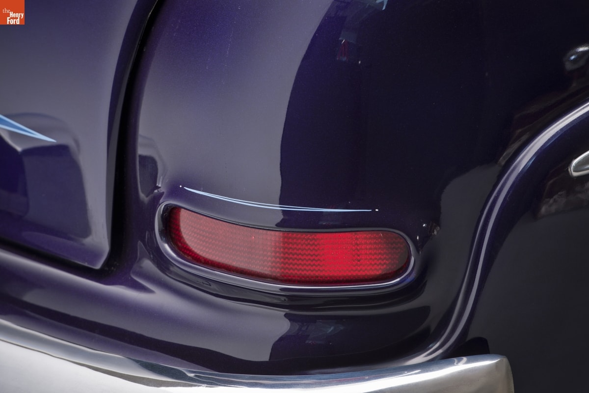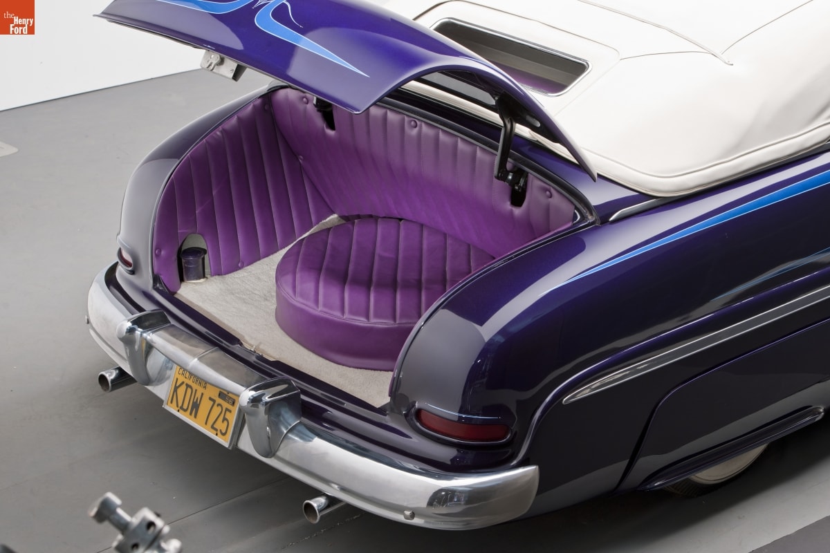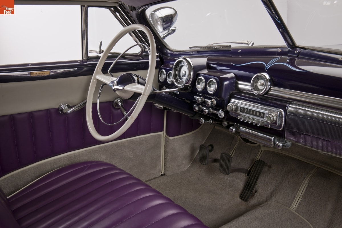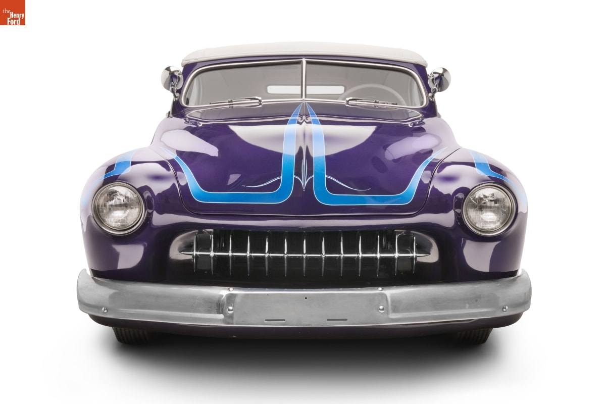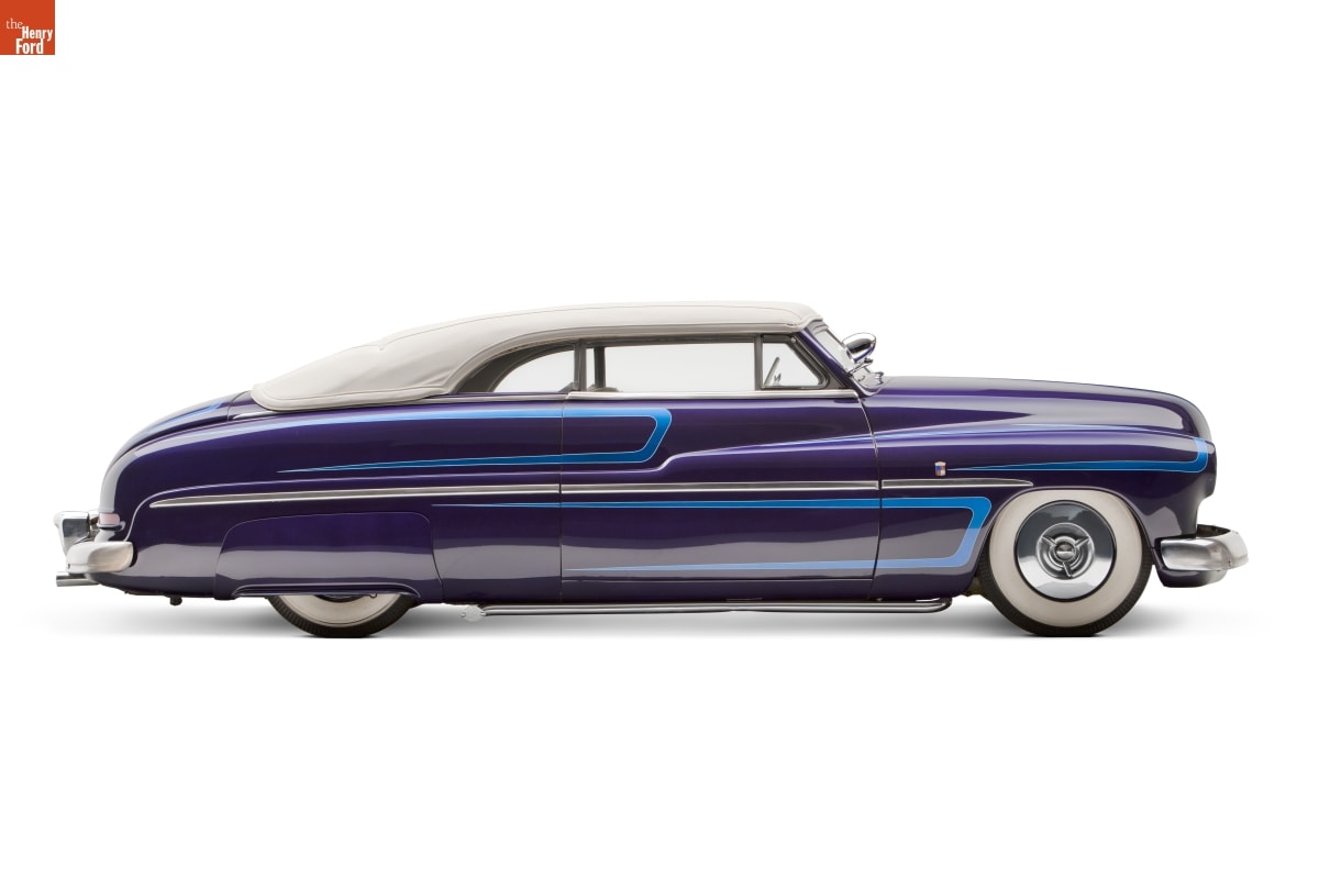 Long, low, and well rounded, stock 1949-51 Mercurys became the favorite cars of 1950s customizers. When lowered even more and smoothed out by filling body seams with lead, these Mercs were called "lead sleds." This car shows many early customizing techniques. It was updated in the 1960s with sparkly Metalflake paint and blue "scallops."