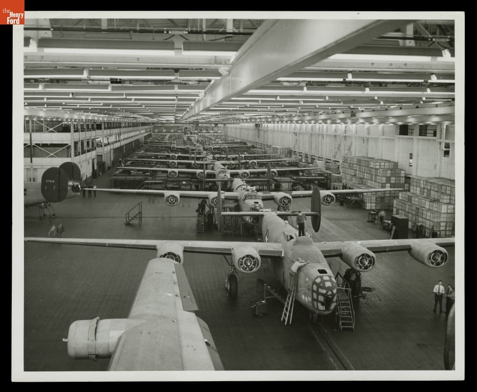 At Willow Run, Ford Motor Company built B-24 bomber planes for World War II using automobile mass production techniques. Airplanes were much more complex than cars. They required constant design changes poorly suited to a standardized assembly line. Ford overcame these difficulties and, at the plant's peak, Willow Run crews produced an average of one bomber every 63 minutes.