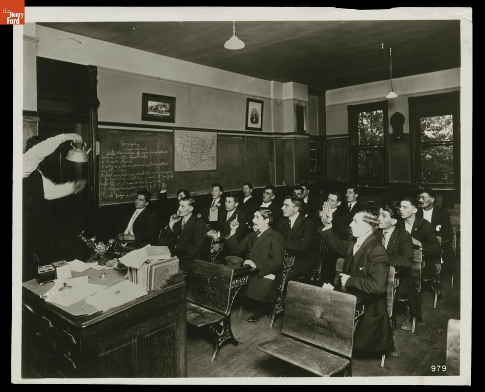 Founded in 1914 to address the language needs for Ford's ever-expanding immigrant labor force, the Ford English School used this method of language training to quickly give students a basic and functional vocabulary of English words to help them integrate into American society. In addition to English, the school also taught students, many attending classes before or after their regular shifts, the requirements needed to pass citizenship tests including American geography as seen on the blackboard in the background.
