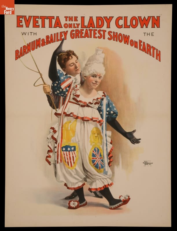 Circus poster printed at top: EVETTA THE ONLY LADY CLOWN / THE BARNUM & BAILEY GREATEST SHOW ON EARTH Inscribed at lower right: Copyright 1895 By THE STROBRIDGE LITH--CO Cin'ti & N.Y. Printed upper right in image: B-15