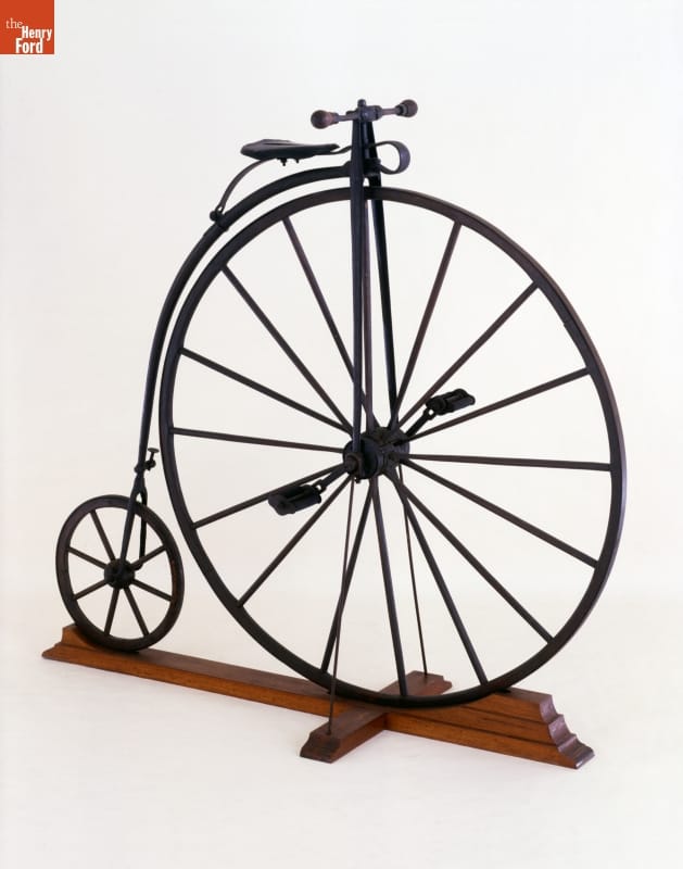 This wood-wheeled bicycle from the 1870s is an example of an early high-wheel ordinary. The ordinary evolved from the velocipede of the late 1860s. Innovators enlarged the velocipede's front wheel, which made traveling great distances quicker. Future improvements such as steel-tube-frame construction, ball bearings, and wire wheels with rubber tires made the high wheeler a popular recreational and sporting vehicle.