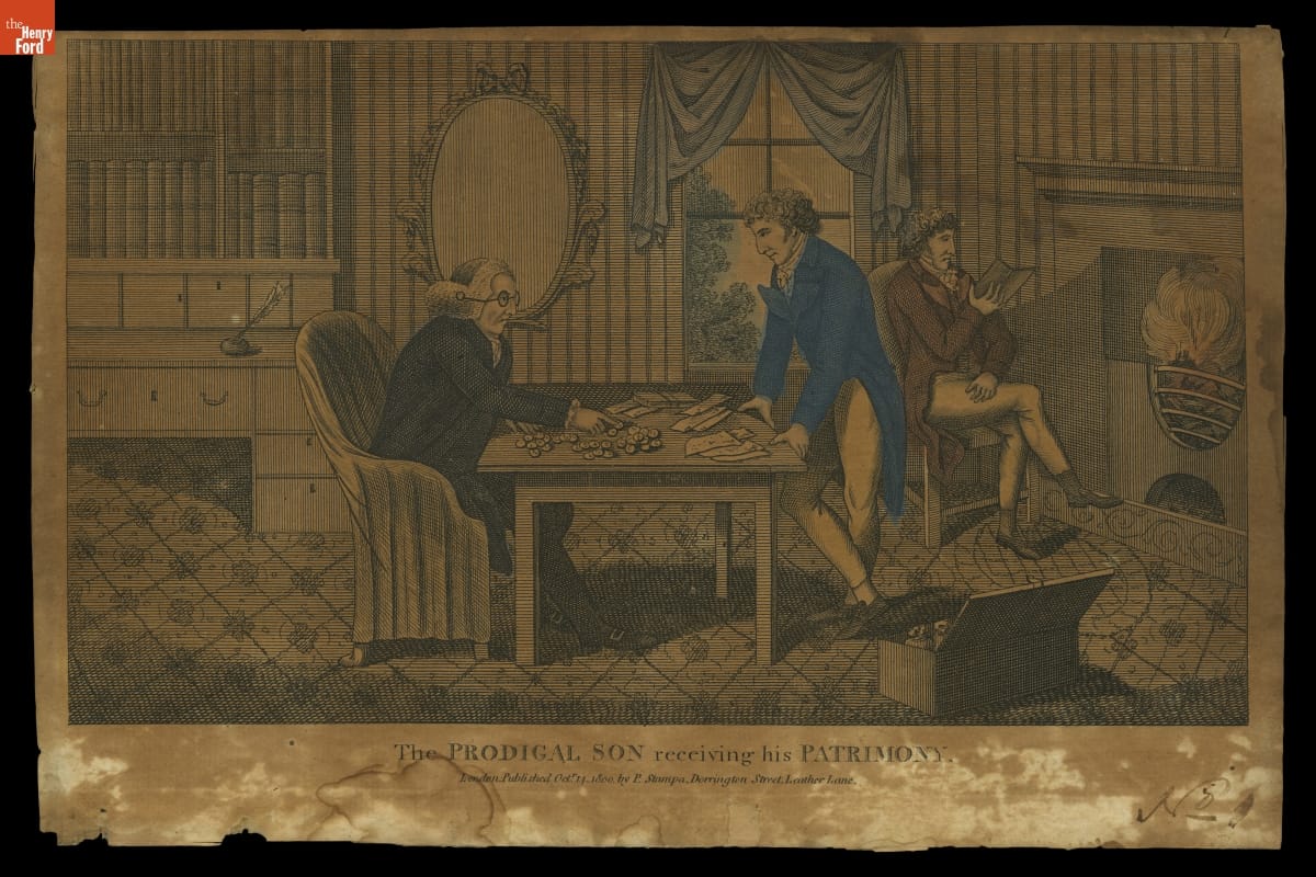 This is the first scene in the New Testament parable of the Prodigal Son updated to 1800. Here, the younger son asks for his share of his father's fortune and is in the process of receiving it, in the father's comfortably furnished study. The father is counting out his legacy, earned as a merchant. We see his large desk and bookcase at the left, complete with a quill and inkwell.