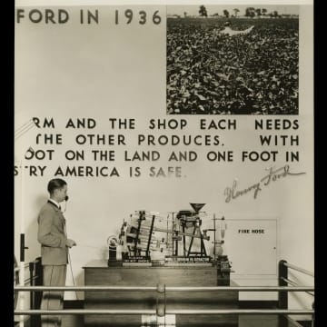 Henry Ford had a vision of farmers being part of the industrial process -- an idea he called "chemurgy." This idea was most completely played out in his experimentation with soybeans, a versatile crop that could be used for industrial products as well as food. This model demonstrates how oil could be extracted from soybeans and converted into many plastic-like products.