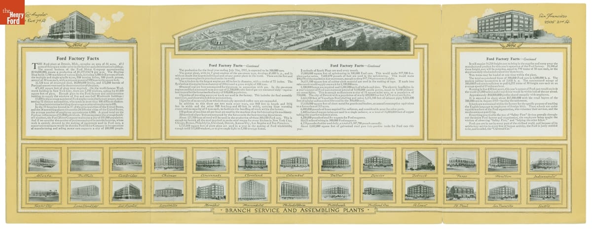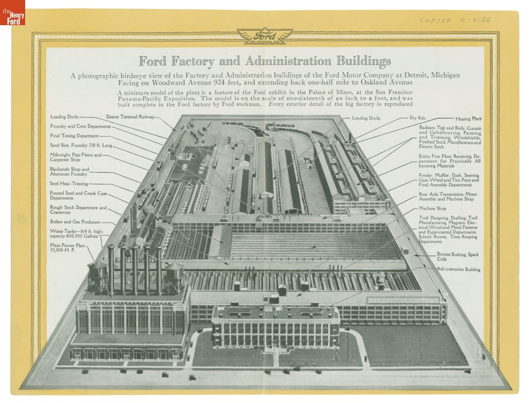 This Ford Motor Company leaflet discusses its exhibit at the Panama-Pacific Exposition, the Model T, and its U.S. factories. The image of the main plant at Highland Park, Michigan, illustrates the comprehensive manufacturing operations. The plant had facilities for casting, machining, stamping, assembly, and shipping. The massive power plant with five smokestacks generated the factory's electricity.