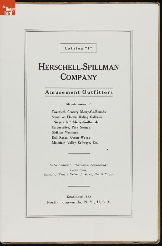on front cover: HERSCHELL SPILLMAN COMPANY / IMPROVED / MERRY-GO-ROUND / MANUFACTURERS / OF / MERRY-GO-ROUNDS, OCEAN WAVES, / CAROUSSELLES, FERRIS WHEELS, / STRIKING MACHINES / GENERAL AMUSEMENT OUTFITTERS / NORTH TONAWANDA, NY