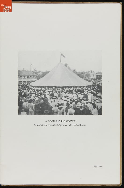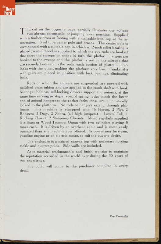 This catalog highlights the products of Herschell-Spillman Company, from portable merry-go-rounds to large stationary "carousselles." This company, one of the most popular and successful American carousel manufacturers of the early 20th century, combined a method of shop production to produce carved wooden animals with their expertise in steam engines and boilers for efficient operation of their merry-go-rounds and carousels.