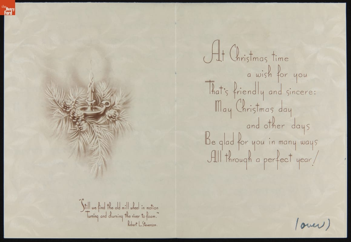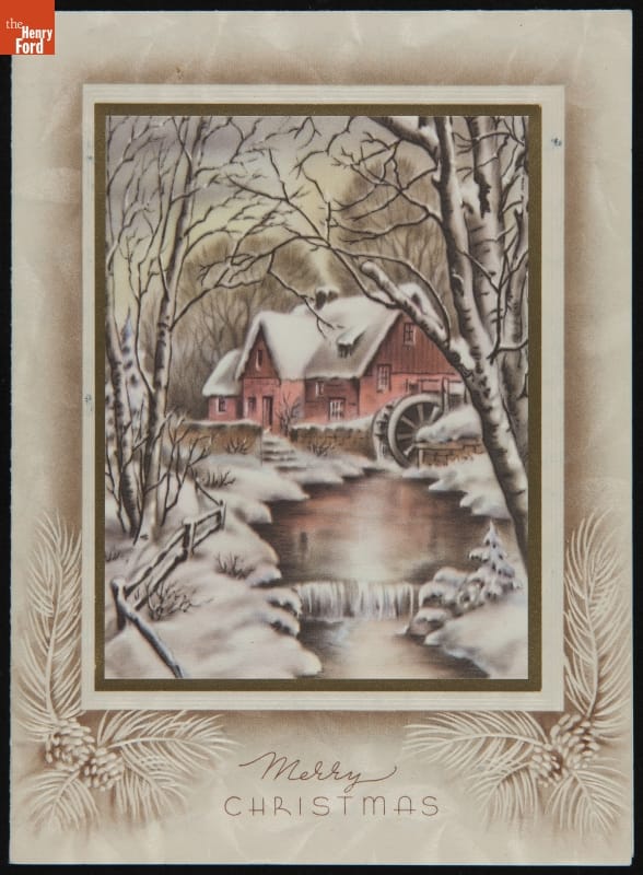 Mailing colorful, commercially designed greeting cards had become an American tradition by the 1920s and 1930s. Friends and neighbors commonly exchanged cards that wished one another a merry Christmas or happy New Year during the winter holidays. Publishers sometimes decorated these cards with nostalgic images of mills, churches, or covered bridges steeped in snow.