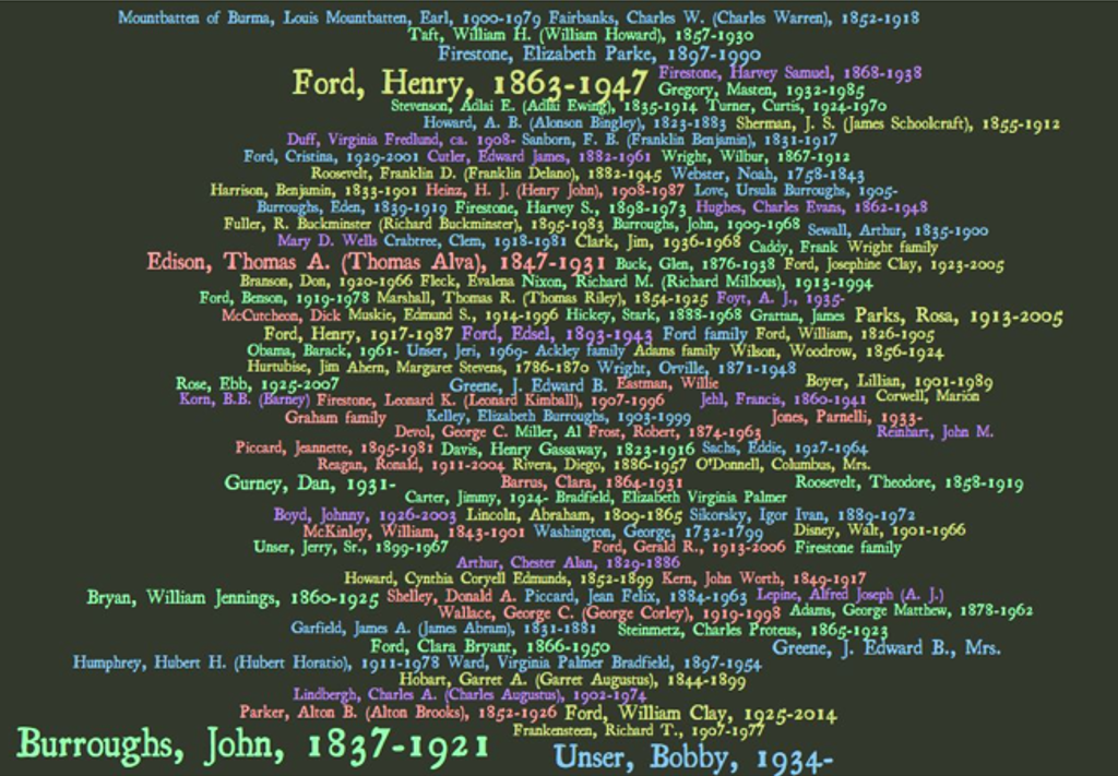 12. Beyond the creator, we also track other individuals associated with objects. The people associated with the most artifacts we digitized this year are: John Burroughs, Henry Ford, Bobby Unser, Thomas Alva Edison, Dan Gurney, Elizabeth Parke Firestone, Rosa Parks, and William Clay Ford.