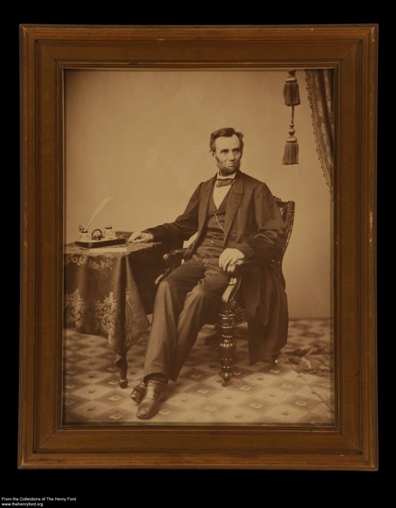 While Henry Ford did not have much interest in military or political figures, Abraham Lincoln was the exception. Lincoln, like Ford, was a self-made man and Ford greatly admired his leadership during a difficult time in U.S. history. Henry Ford collected many Lincoln-related artifacts, from the Logan County, Illinois courthouse where Lincoln practiced law in the 1840s to the chair he was sitting in the night of his assassination in 1865. Ford also sought many smaller artifacts to bring this great president’s story alive to inspire schoolchildren and guests visiting Greenfield Village. Photographs that Henry Ford gathered included some 19th-century originals, but also many copy photographs of important images. From the 1920s to the 1940s, Ford had professional and highly skilled photographers in his company’s Photographic Department make many large format and high quality copies of historical originals.