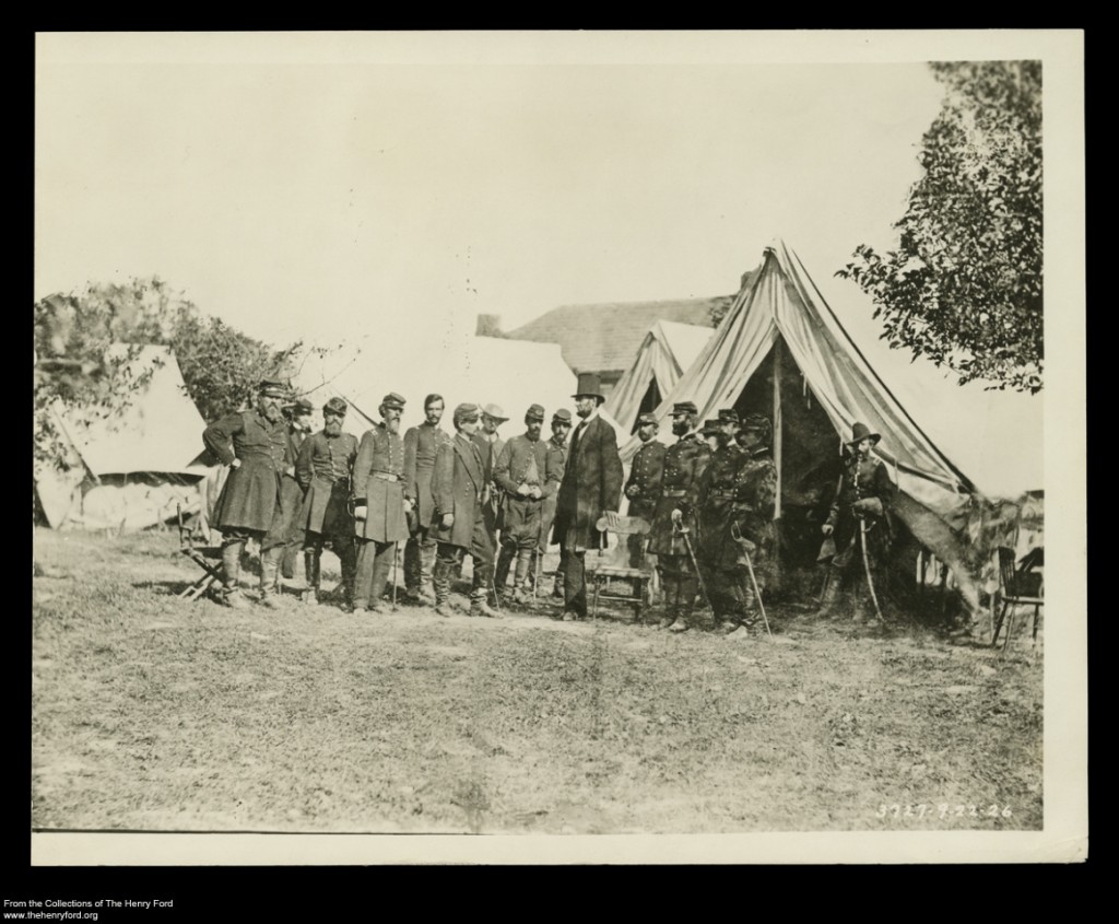 During the Civil War, President Abraham Lincoln often conferred with his military commanders in the field, as this image of an 1862 visit to General George B. McClellan and his officers at Antietam, Maryland, shows. Lincoln – at 6-foot 4-inches and wearing his distinctive top hat – towers over McClellan and his officers. Alexander Gardner took the original photograph on October 3, 1862. This copy print was made in 1926 by the Ford Motor Company Photographic Department in Dearborn, Michigan.