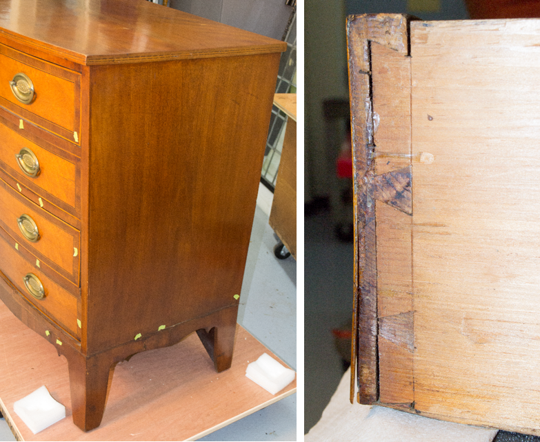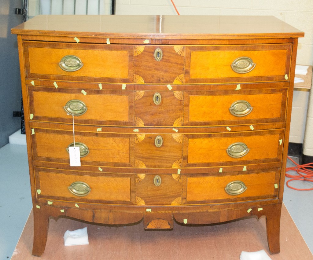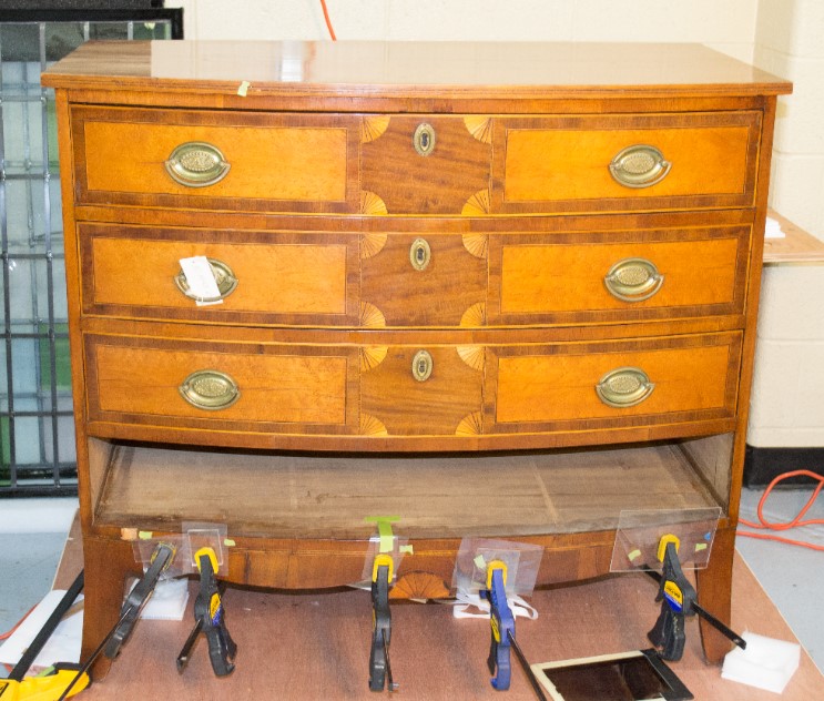 The conservation of this chest of drawers started with a detailed examination to identify every area of damage to both the finish and the structure of the artifact. Each area of damaged veneer was labeled using a small piece of removable tape and the item was photographed.