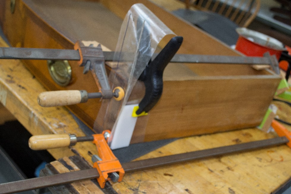 The lifting veneer was then reattached by inserting new hot hide glue using a syringe and small spatula. Hide glue has a short working time, so the repairs had to be completed quickly by working in small sections at a time. A piece of silicone coated Mylar was placed on each area followed by a piece of Plexiglas, and finally a clamp to press the veneer back into a flat position. Some areas were much easier to clamp then others.