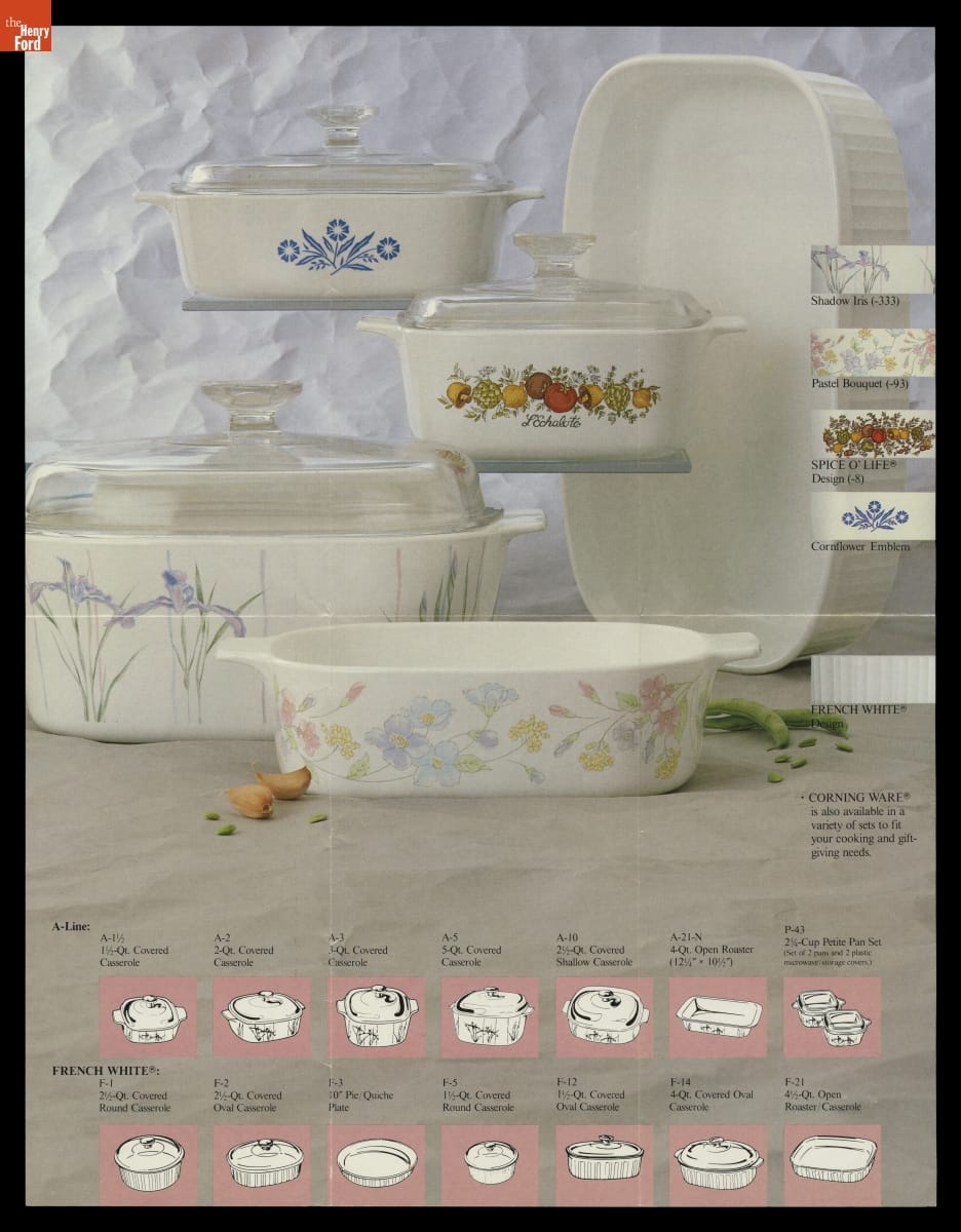 This Corning Ware brochure shows patterns available in 1987 — Shadow Iris, Pastel Bouquet, Spice O’ Life and the iconic Cornflower Emblem — as well as the now-classic French White line of casseroles. / THF709300