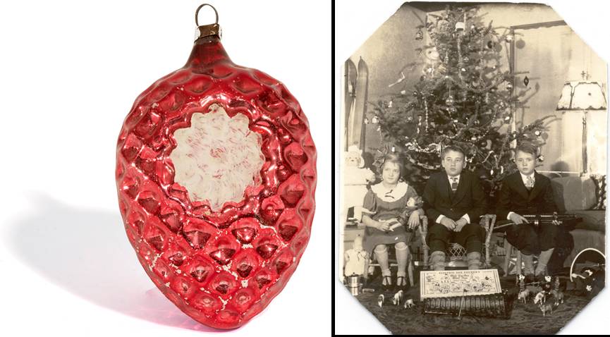 Max Eckardt, who’d been instrumental in securing blank bulbs from Corning for his four New Jersey decorating plants before the war, produced some of the most popular domestic ornaments under the name Shiny Brite. Examples of Shiny Brite ornaments from The Henry Ford’s collection document the development of American ornaments through World War II.