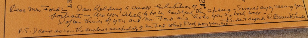 The Ford papers also contain catalogues of Linder’s exhibits, including the prestigious Knoedler Gallery in New York, where Mr. Linder exhibited in 1920, 1926 and 1942; several catalogues feature photos of the Fords as well as other industrialists. Clearly, Mr. Linder – although little known today – was an important society portrait artist in the 1920s and 1930s.