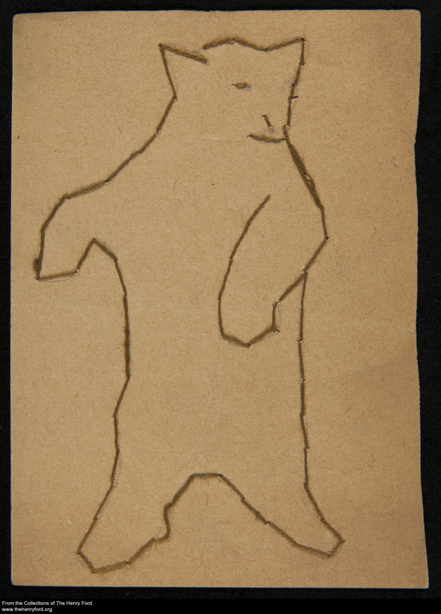 It should come as no surprise, given the founder of this institution, that our digital collections already contain hundreds of items related to Henry Ford’s son, Edsel. We’ve just expanded this selection by digitizing some of Edsel’s childhood artwork. My personal favorite is this bear, made of brown thread stitched into paper and likely created when Edsel was between 5 and 10 years old, but other pieces include family portraits, highly geometric works, and slightly later, more sophisticated works. View these and other items related to Edsel Ford in our online collections.