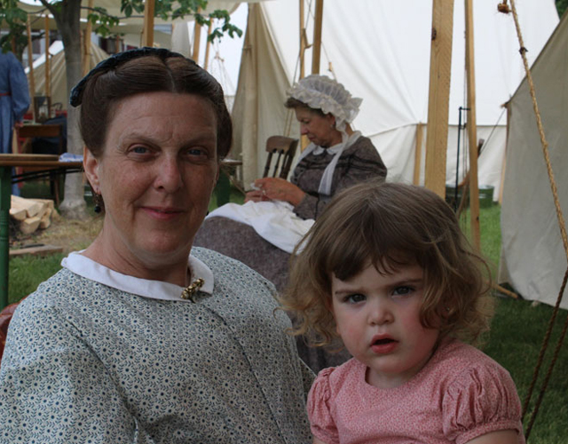 I talked with Lorna Paul, a long-time participant in the Civil War event at Greenfield Village. She's a member of the 4th Michigan Co A Voluntary Infantry Reenactors, which also has civilian and infantry contingents. Lorna was encouraging and explained to me how her involvement grew. Like Dave Tennies from the 21st Michigan, it was Lorna's children who prompted the family's involvement in reenacting years ago. Her children are now grown and don't participate often, but her two-year-old granddaughter enjoys accompanying her to events. Lorna is a seamstress, and she often makes and repairs period clothing for other reenactors. (I actually met quite a few reenactors who are able to incorporate their love for history with their work.)