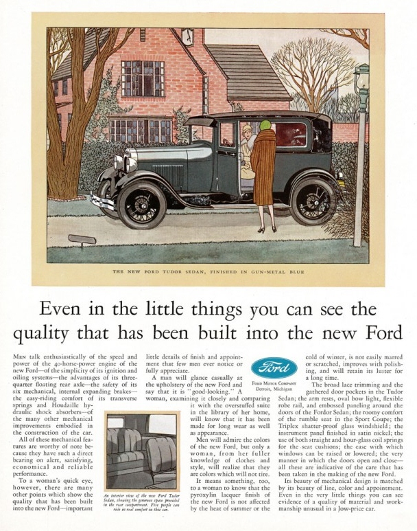 When interest and enthusiasm for the Model T waned in the mid-1920s, Ford Motor Company stopped production on the world’s most popular car and in December 1927 debuted the 1928 Model A. The new Ford was a beautiful car, modern and stylish, and the advertisements followed suit. This ad relies heavily on a distinct gender binary by focusing on the different features of the Model A that would appeal to men and women. “Men will admire the colors of the new Ford, but only a woman, from her fuller knowledge of clothes and style, will realize that they are colors that will not tire.” This statement perfectly exemplifies the attitude in auto advertising that still continues to this day, namely relying on the assumption that men buy cars based on speed and horse-power, while women focus on aesthetics and comfort.