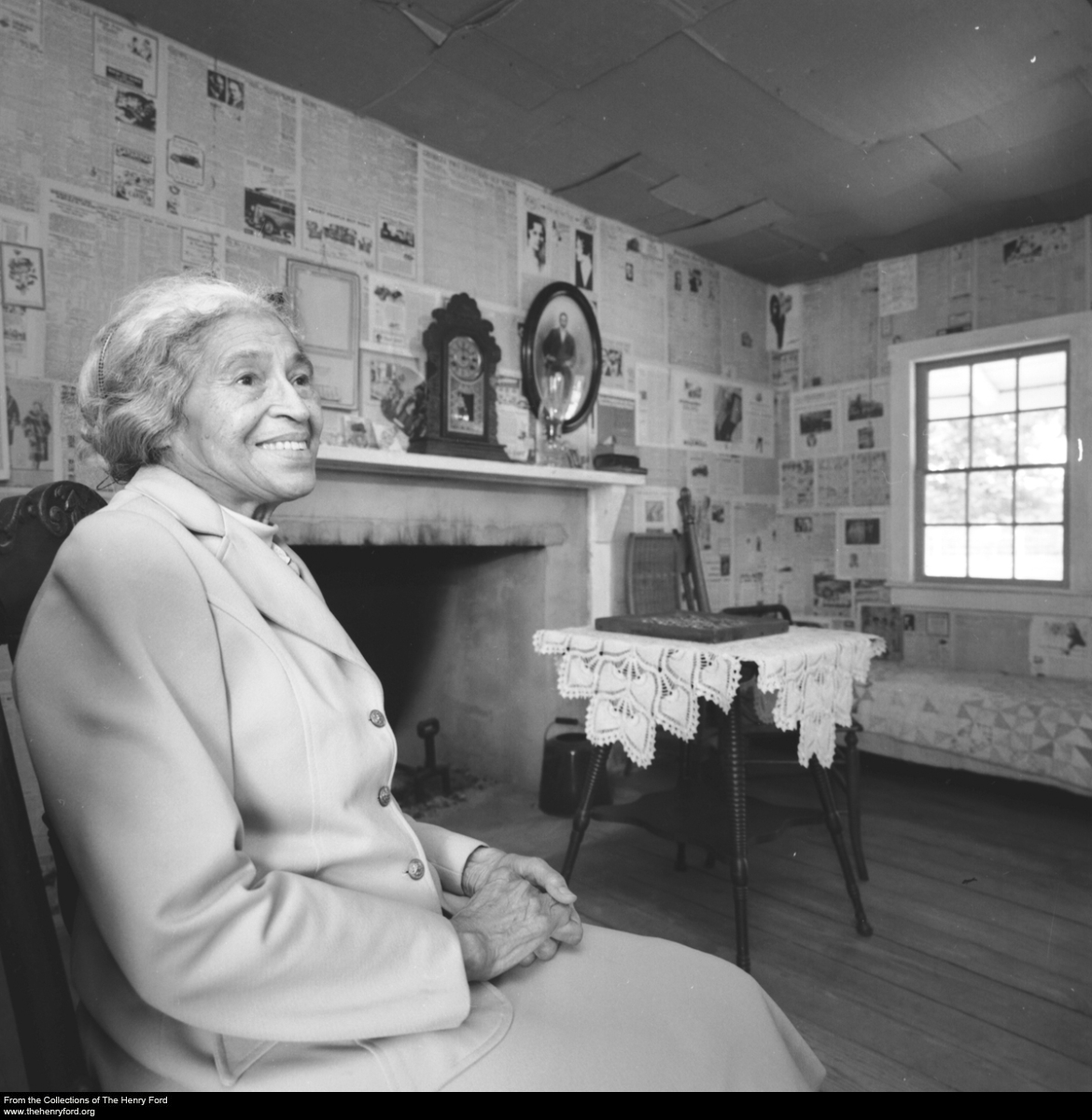 In 1992, Rosa Parks visited Greenfield Village with a group of students during a "Freedom Tour" sponsored by the Raymond and Rosa Parks Foundation. After she spoke to students, she posed here in the Mattox House, the 1930s Georgia home of an African American family. / THF123775