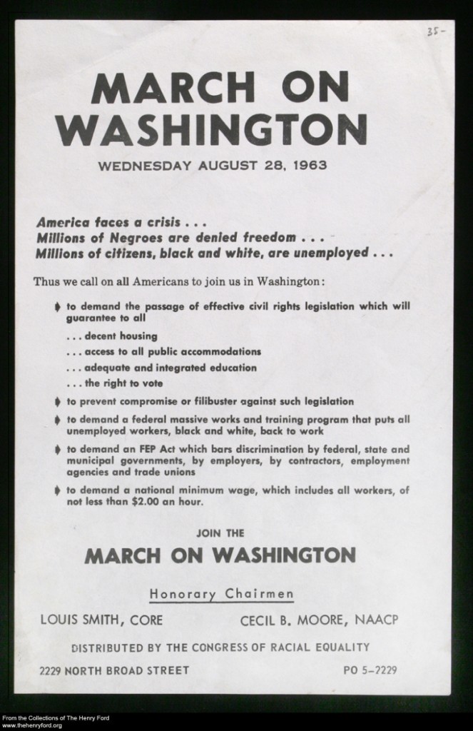 Once they decided to join forces, several black Civil Rights organizations came together to plan the Aug. 28, 1963, March on Washington. Each group had different outlooks, agendas, and reasons for being there. But, working together, they created the list of demands on this handbill. While all the leaders could rally around the new Civil Rights bill that President Kennedy had just introduced to Congress, most of them wanted more—more assurance of jobs, reasonable wages, and an end to segregation and discrimination. Handbills like this one were posted in local communities to inspire people to attend the March.