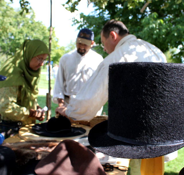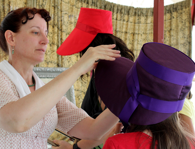 We enjoyed visiting the merchant tents. The millinery was an active spot with many hats to try. There was a men’s hat maker, pewterer, a textiles’ seller and a wax portrait artist.