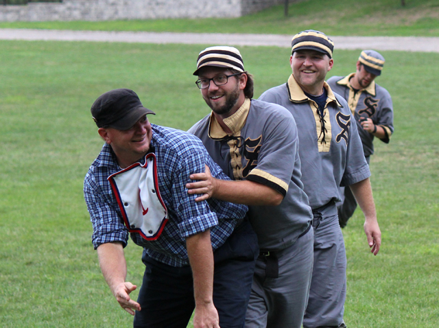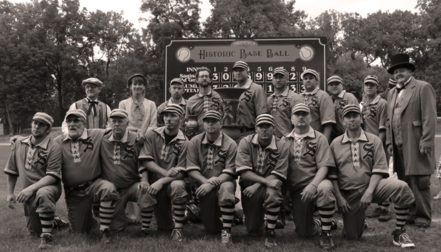 During the second weekend of August, the attention of everyone is usually focused on this seemingly unassuming patch of grass behind Cotswold Cottage. Groups of people from all over the Midwest put on uniforms reminiscent of 1867, bring a bat they made themselves, leave their gloves at home and prepare for two days to relive the glory of their times. Visitors bring their chairs, find a spot on the hill with plenty of shade, pick up a free program, and keep track of the day’s results. The kids who come don’t see computer programmers, lawyers, government employees, or professionals. They see ball players that they want to emulate. The players sign an autograph and pause for a picture to help commemorate the occasion. Sure, we would love to raise a trophy, but the best reward is the sight of our spectators coming back day after day, year after year.