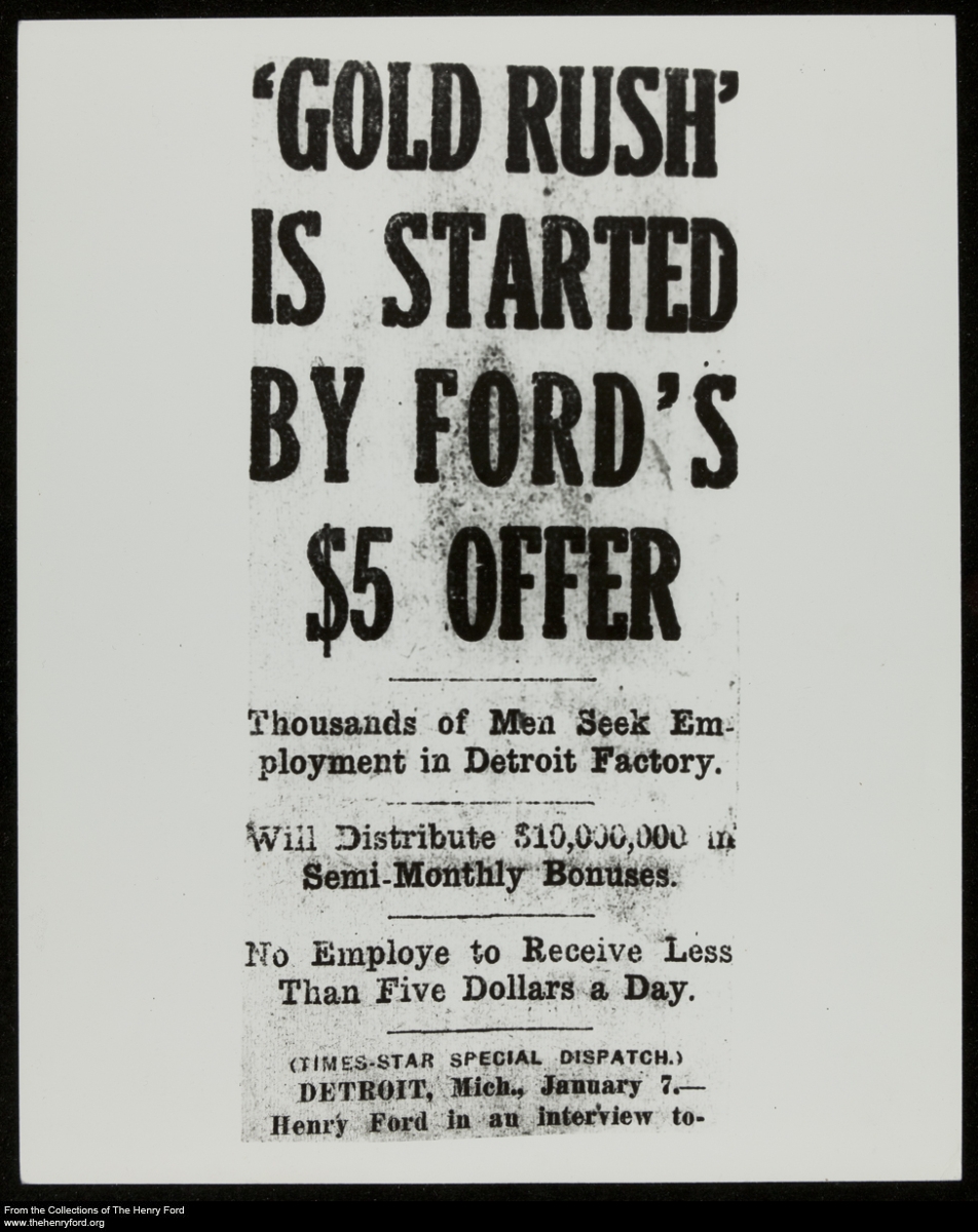 Photographic print - "Newspaper Article, "Gold Rush is Started by Ford's $5 Offer," January 7, 1914" - Ford Motor Company