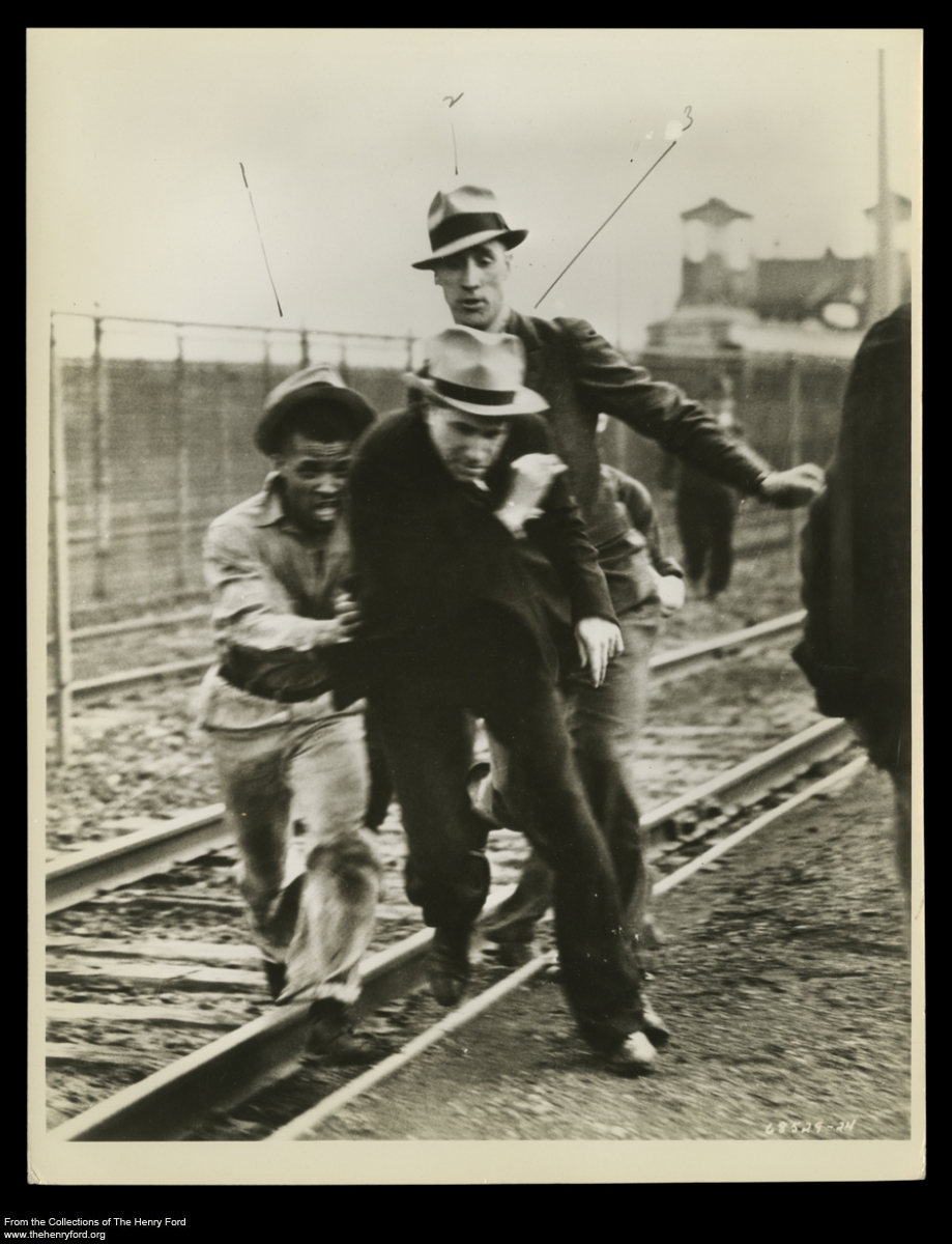 In May 1937, an event took place that would become a touchpoint and rallying cry in the history of labor organization: the Battle of the Overpass. Numerous United Auto Workers organizers, including Walter Reuther and Richard T. Frankensteen, arrived at the Ford Motor Company Rouge plant in Dearborn, Michigan, shortly before shift change, intending to hand out flyers to plant workers. Instead, the organizers were attacked by Ford employees. We have just digitized a number of photographs documenting those events, including this one showing union representative Robert Sentman being chased by Ford Service Department men. View photos from our digital collections about the Battle of the Overpass, or learn more about the day’s events and aftermath on our website and via the Walter P. Reuther Library.
