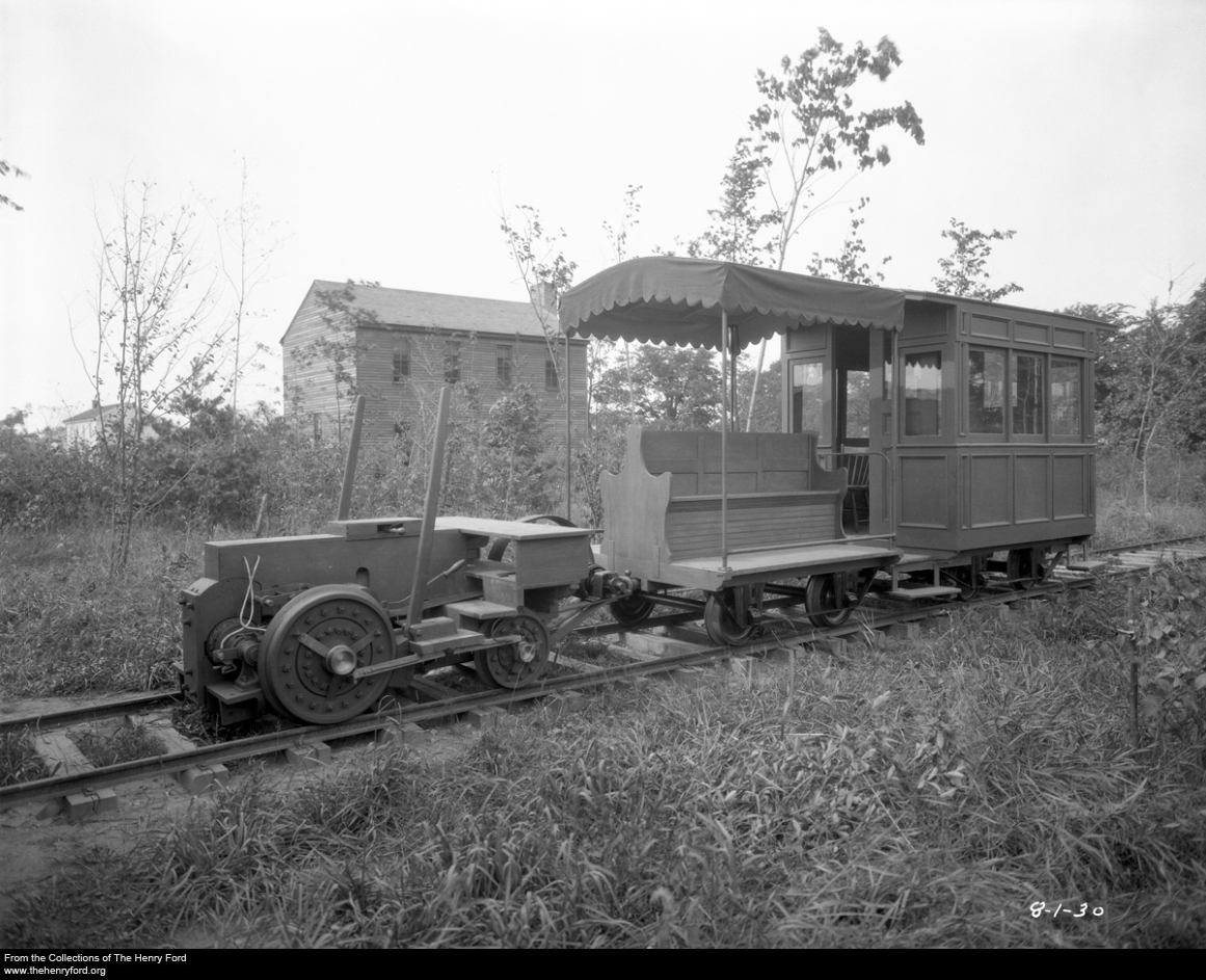It is likely that Francis Jehl, who had worked with Edison on the project before working here, was the only engineer. The picture, shown above, is of Jehl in the locomotive giving a ride to approximately 20 people. A note on the corner of the picture lists the date as Aug. 1, 1930. The relative age of the passengers pictured in the cars suggests these were probably Edison Institute students.