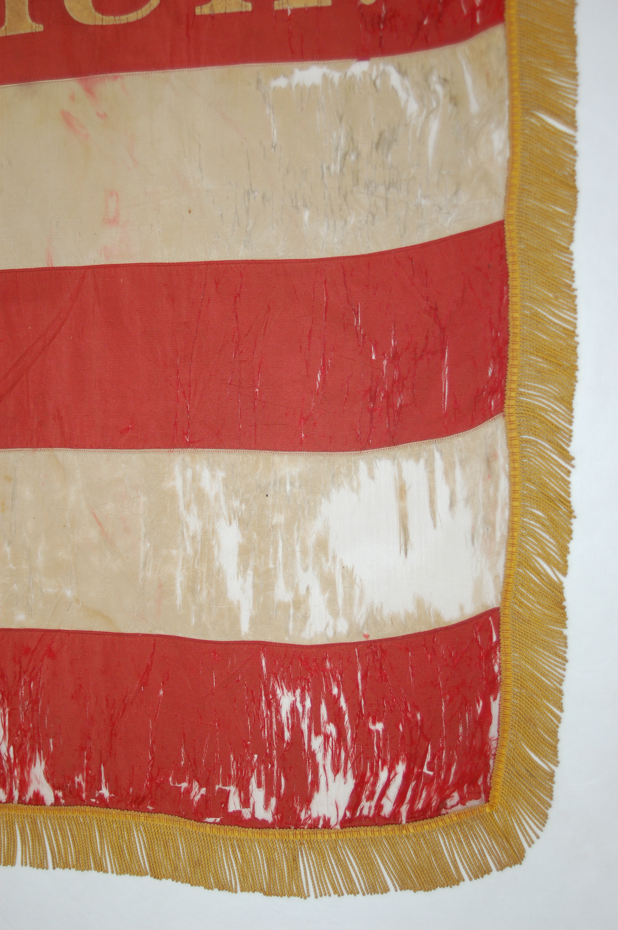 This flag dates from the end of the 19th century and was used by a G.A.R. post in Lyons, Michigan. The G.A.R. (Grand Army of the Republic) was a Union veterans’ organization formed after the Civil War and there were posts in almost every town in Michigan. This flag would have been used in parades on patriotic occasions in Lyons. In 1917 the flag was donated to the town “to raise at funerals of G.A.R. or veterans of any war.” It was displayed for many years in the Lyons-Muir Historical Museum. Its caretakers recognized the need to preserve it and brought it to Textile Conservator Fran Faile.