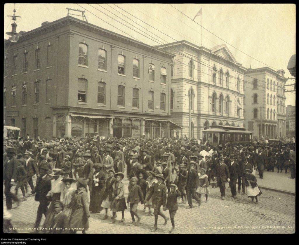 This lively scene from 1905 documents African Americans proudly parading through the streets of Richmond, Virginia, in celebration of Emancipation Day. The well-dressed marchers include many elders who were formerly enslaved, as well as many of their children and grandchildren born after the end of slavery. In 1905, forty years after the American Civil War ended, this life-changing event—Emancipation—continued to have deep, emotional meaning for African Americans.