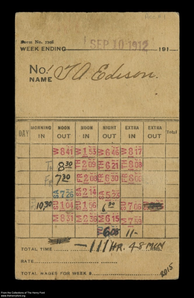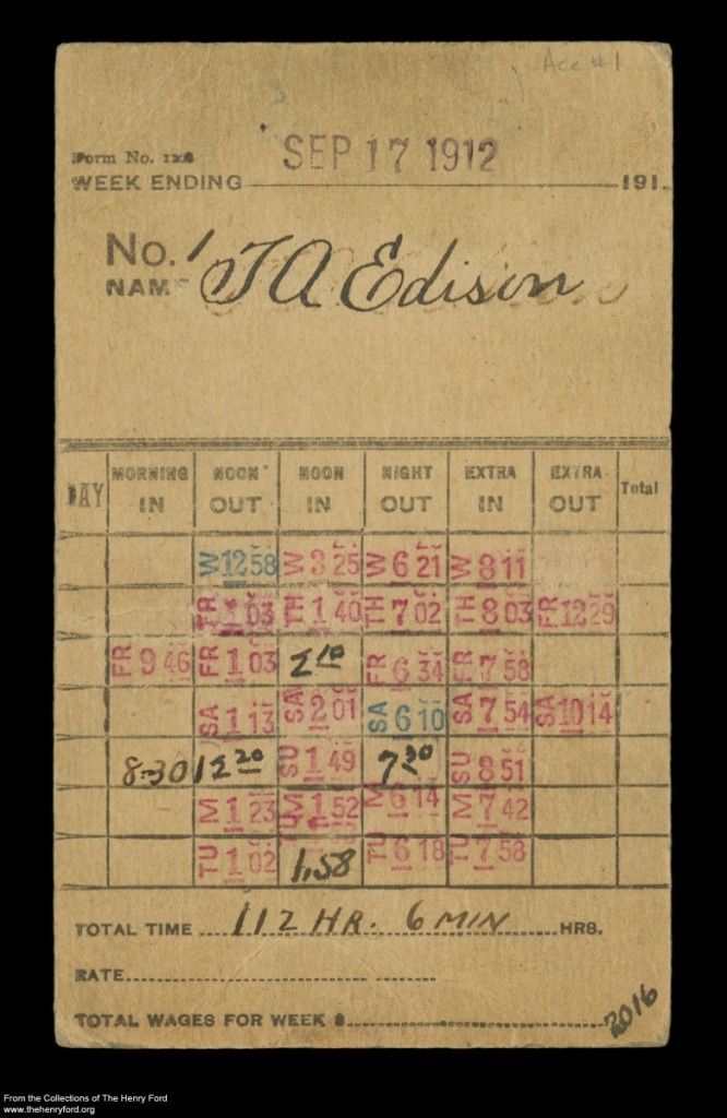 A 40-hour work week can be long. Now double that, or possibly even triple it. Out of the 168 hours in a week, imagine putting in 90, 100, or 110 hours’ worth of work. That may seem like a daunting task, but what if it was something you were so passionate about, the word “work” represented something totally different to you? While others might have a negative association with the word “work,” what if your interest in work led you to experience joy? Soon hours would melt away and a long week for others, would seem like nothing to you. It’s my belief, that this is how Thomas Edison operated. This is why he was so successful. His work meant something totally different to him. These time cards document that.
