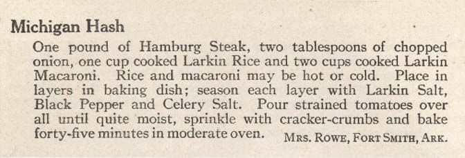 The Larkin Company operated a booming mail order business that sold soap, packaged foods and other household products to millions of American housewives. This cookbook is filled with prize-winning recipes submitted by Larkin customers to the company’s recipe contests.